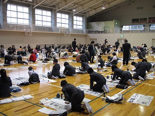 3~6年生は,体育館に集まって毛筆での書き初めです。