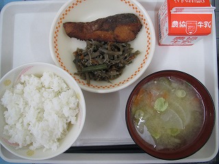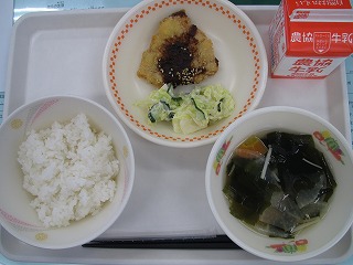 ごはん、ブリのいしる風味揚げ、きんぴらごぼう、うち豆汁、牛乳