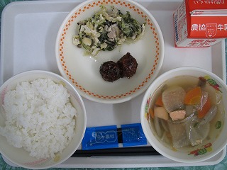 ごはん、イカボールのタコ焼き風、はりはり煮、せんば汁、牛乳
