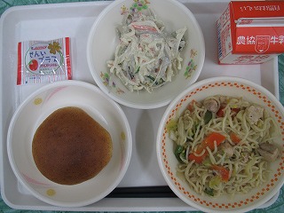 はいがパン、ひるぜんやきそば、かみかみサラダ、りんごジャム、牛乳