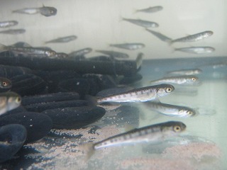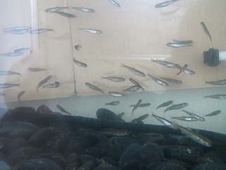 児童は、群れて素早く動き回るサケの稚魚に、びっくり。