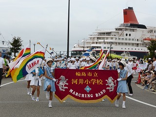 いつもよりちょっと早めに給食を食べ,4~6年生が輪島港に寄港した豪華客船『ぱしふぃっくびいなす』をお見送りしにマリンタウンまで行ってきました。
