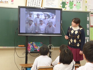 給食ができるまでの様子を撮影した写真の数々を見ながら、栄養士さんが説明をしてくれました。