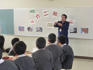 今年も、輪島漁協と市農林水産課の方々の協力を得て、6年生児童47名に1人1杯、香箱ガニが給食につきました。