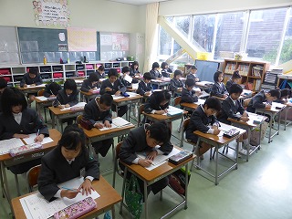 1~2年生は教室で硬筆、3~6年生は体育館で毛筆に取り組みました。