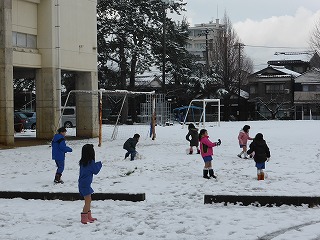 子どもたちは大はしゃぎで雪遊びにいそしんでいます。