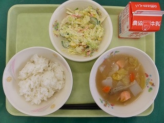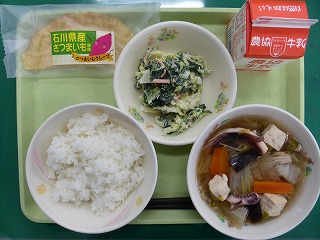 ごはんいしる鍋、ポパイサラダ、さつまいもクレープ、牛乳