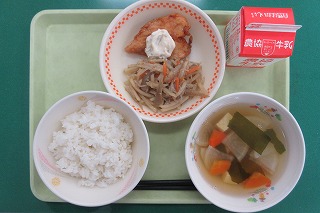 ごはん、チキン南蛮、じゃがいものキンピラ、すまし汁、牛乳