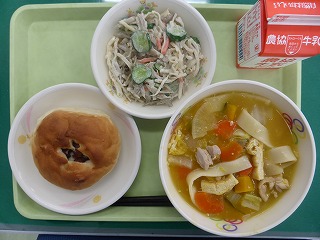 豆パン、ほうとう、かみかみサラダ、牛乳