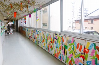 出来上がった七夕飾りは、職員作の本物の竹を使った笹飾りと共に、職員室前に掲示されています。