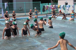 6年生にプールでのルールをならいながら、まずは小プールへ。