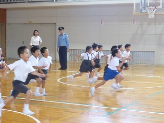 訓練の後には、低学年は体育館、高学年は集会室『風』にて、不審者に出会ったときの対応についてお話しをききました。