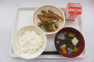 ごはん、ハタハタのいしる揚げ、茎ワカメのキンピラ、もずくのみそ汁、牛乳