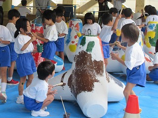 自身もペンキまみれになりながらも、とてもいきいきと海の生き物や灯台など、思い思いの絵をを描いていました。