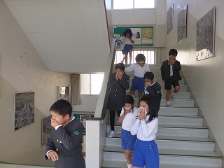 本日、昼休みに給食室から出火したという想定で、避難訓練を行いました。