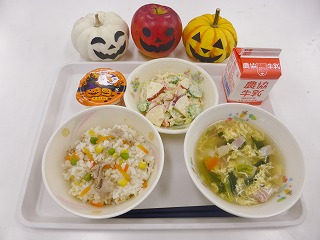 今日の給食にも、ハロウィンにちなんで、リンゴ入りのサラダとカボチャのデザートが出ました。