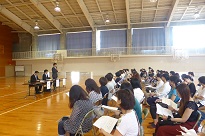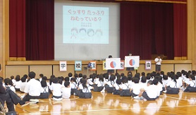 保健委員会の皆さんの発表と市役所の宮中さんのお話しです。保護者の方と一緒に睡眠の大切さについて学びました。