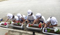 児童玄関にきれいな花をたくさん植えました。大切に育てます。