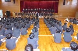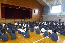 その後、体育館で校長先生のお話を聞きました。