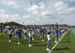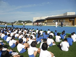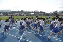 河井小学校では、体力向上のために走る取り組みをしています。10月に入りマラソン練習も始めました。今日は、自己ベストを目指してマリンタウン陸上競技場を走りました。