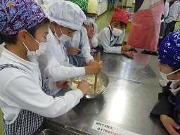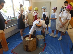 今日は、杵と臼で糯米を搗いて餅を作る体験をしました。公民館の方に教えて頂きながら、餅つきを体験しました。ほとんどの児童にとって、はじめての体験でした。