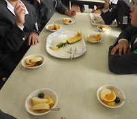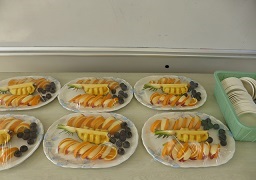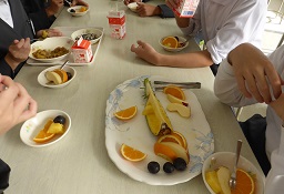 ランチルームで、フルーツバイキングをしました。今日は6年生です。配送校も順番に実施します。