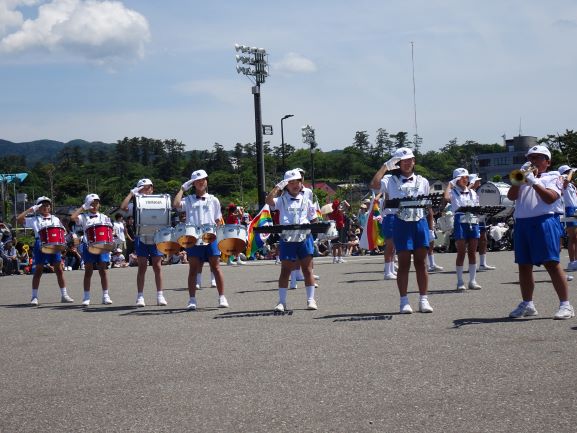 6月1日(土)に素晴らしい晴天のもと、輪島市民まつりが開催され、河井小学校から5.6年生(横断幕は、4年生)で構成される金管鼓隊が参加しました。