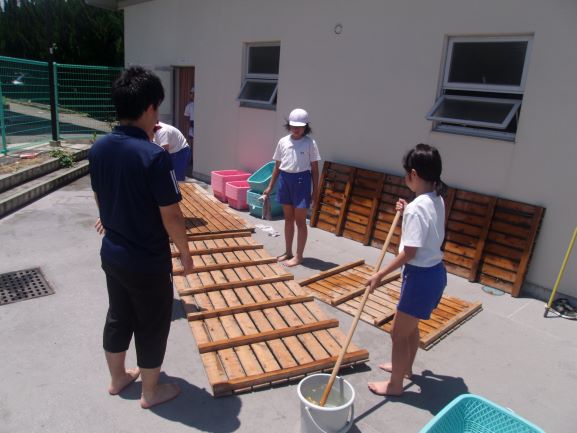 5年生は、プール周囲のゴミ拾い、掃除、更衣室の掃除です。6年生は、プール本体を洗剤できれいに洗いました。