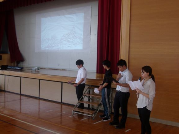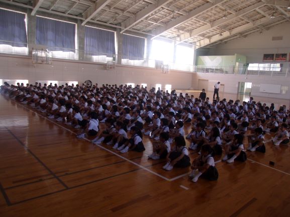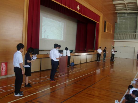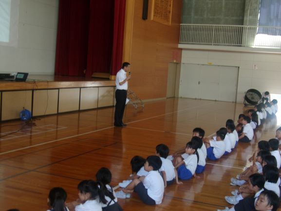 8月6日(火)今日は、全校登校日でした。日焼けした元気な顔を久しぶりに見ることができました。今日の全校集会は、先生方による読み聞かせ(平和に関する絵本)からスタートしました。先生方のやさしい朗読と映像で絵本の世界に入ることができました。「平和っていいな」って感じられる時間でした。そのあと、校長先生のお話がありました。広島に落ちた原爆のこと、ルール・マナー・エチケットについてでした。特に、海水浴場に関するきまりや公共施設での過ごし方など夏休み前半での出来事をについてのお話でした。