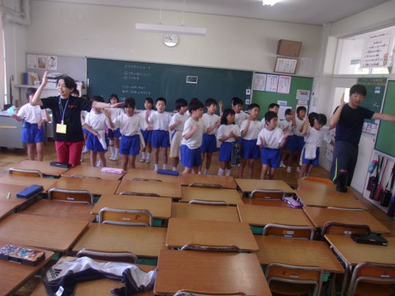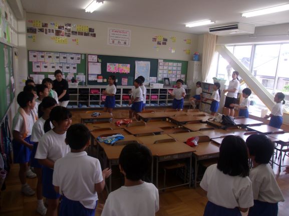 3限目は、三夜踊り練習です。今日は、非常に気温・湿度が高く、体育館での練習は、難しいと判断し、エアコンの効いた教室等で行いました。三夜踊り保存会から7名の皆様にお越し頂き、各学年に分かれて指導をして頂きました。子どもたちは、暑さを気にせず、大変涼しい中で練習ができました。