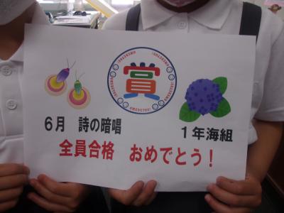河井小学校では、毎月学年毎にお題を決めて詩の暗唱を行っています。6月もスタートしました。今年度は、密になることを避けるため、曜日ごとに検定学年を決めました。6月1日は、1年生の日です。1年生は、早速暗唱した詩を校長先生の前で披露していました。合格した児童には、素敵なシールが贈られます。6月1日の1日で、1年海組さんが全員覚え、校長先生から合格証をもらうことが出来ました。1日で全員合格するなんてとてもすごいことです。他の学年・学級も頑張ってくださいね。