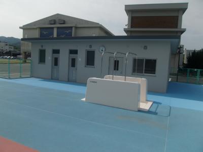 5月31日で昨年秋から行われていた、プール管理棟移設工事が終わりました。プール管理棟は、市道本町宅田線関係で移設対象となり工事が行われました。プール管理棟・更衣室等は、最新の設備となり快適な水泳環境が整いました。更衣室・トイレが綺麗だと気持ちが良いですね。新型コロナ感染予防の関係でプールの授業も制限を受ける部分もありますが、しっかりと安全に気を付けて活用したいと思います。