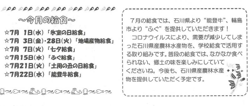 上の記事を見てわかるように、7月は、特別メニューが目白押しです。7/1氷室の日給食 7/3地場産物(トビウオフライ) 7/7七夕給食(七夕ゼリー) 7/15輪島ふぐ給食 7/21土用の丑の日給食 7/22 能登牛給食  7/28地場産物(いかのかりん揚げ)が献立に含まれます。輪島ふぐ・能登牛なんて、びっくりしますね。能登牛は、石川県より、輪島ふぐは輪島市より提供して頂いたそうです。暑い日が続きますが、給食を楽しみにして1日1日を頑張ってほしいです。