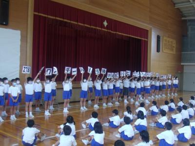 8月7日(金)に、1学期の終業式を行いました。終業式では、新型コロナウイルス感染症の感染防止のため、子どもたちの間隔を広げ、窓の開閉と大型扇風機4台を使用し換気の確保に努めての終業式でした。式では、学校長より1学期をふりかえっての「子どもたちのがんばり」についてや「新型コロナウイルス感染症の感染防止」についてのお話がありました。お話では、子どもたちの頑張る姿がすばらしかったことが伝えられ、子どもたちは、とても満足気な笑顔を見せていました。短い夏休みですが、思い出に残る、凝縮された9日間になることを願っています。1学期、保護者の皆様には、学校へのご支援と共に感染対策についてもご協力いただき本当にありがとうございました。2学期も、どうぞよろしくお願いします。
