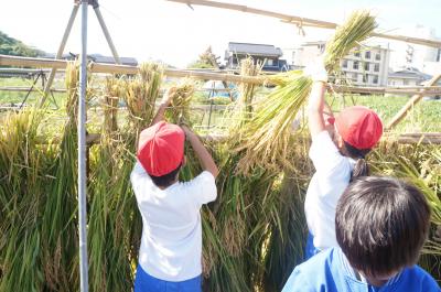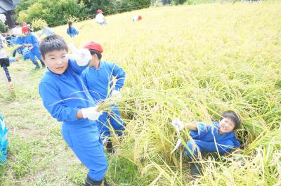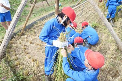 9月16日(水)午後に、4年生が稲刈りを行いました。鵠巣小学校の児童と協力して行いました。稲刈りは、初めてという児童がほとんどでした。最初は、とまどっていましたが、表 正克さんの指導のおかげで、調子が出てくると素早くさっさと稲を刈り、はざ干しをすることができました。子どもたちからは、「楽しい!」「もっとしたい!」という声が聞かれ、大満足の稲刈りでした。
