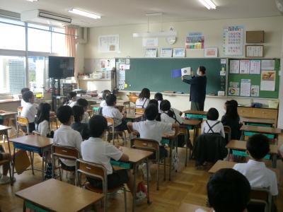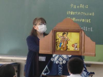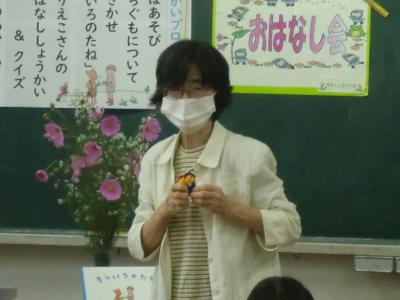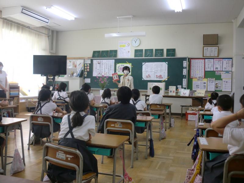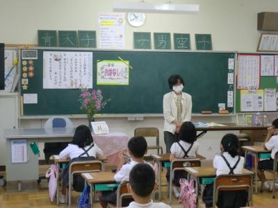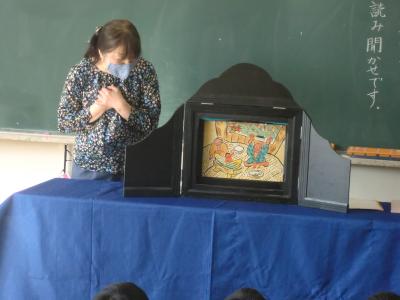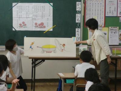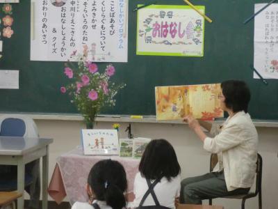 9月30日(水)の2限・3限に輪島たんぽぽ文庫 倉田先生のお話会が1年生を対象にありました。今日は、中川りえこさんの特集でした。プログラムは、①ことばあそび ②くじらぐもについて ③読み聞かせ 絵本「そらいろのたね」 大型絵本「ぐりとぐら」 ④中川えりこさんの本の紹介、なぞなぞなどでした。きれいなお花が飾られ、倉田先生の豊かな表情、表現力に子どもたちは魅了されていました。「本て楽しいな!」「ちがう本も読んでみたいな!」と思わせる、とても楽しいお話会でした。