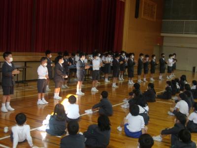 次は、任命式を行いました。河井小学校では、10月より後期の委員会活動がスタートしています。今日は、後期の各委員会の委員長と代表委員の任命式を行いました。校長先生より、1人ずつ任命書を頂いたあと、それぞれが大きな声で抱負を発表しました。とてもしっかりとした内容で、後期の委員会活動も期待できると感じました。河井小学校がよりよくなるように頑張ってください。
