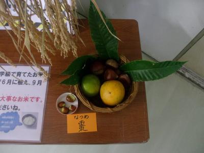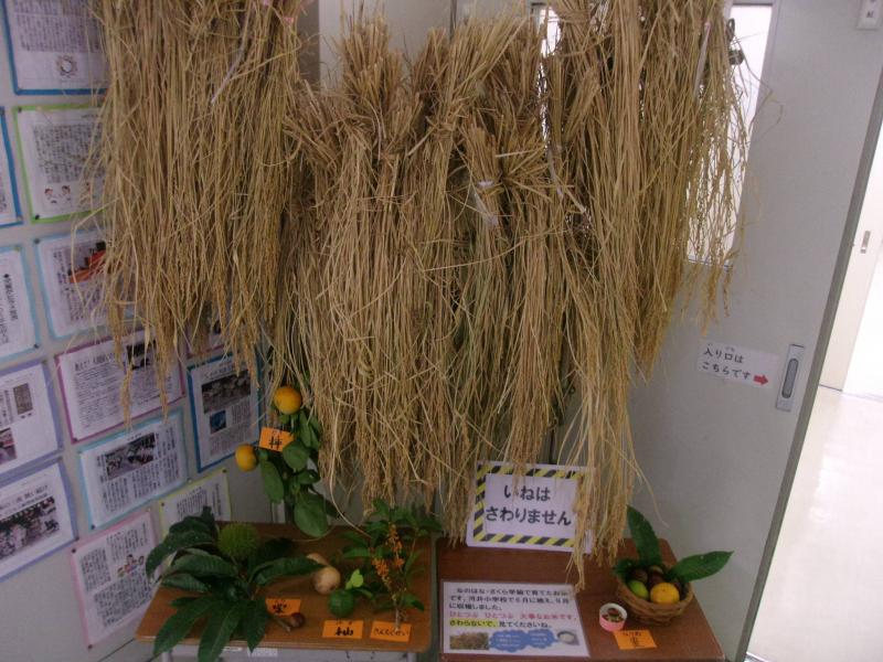 1階のさくら・なのはな教室の前で、秋の味覚が飾られました。これは、さくら・なのはな組の皆さんが行った農作業体験で収穫した稲をメインとしたディスプレイです。はざ干しした稲をイメージしたものとなっており、秋の味覚(柿・栗・なつめ・柚・金木犀)なども飾られています。季節を感じられる素敵なディスプレイです。ぜひ、たくさんの児童に見てもらいたいものです。