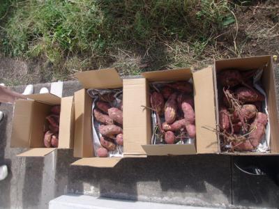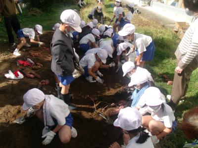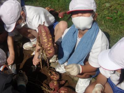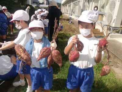 10月15日(木)の2・3限目に、2年生がサツマイモ堀りをしました。今日は、密を避けるために海組が2限目に空組が3限目に行いました。本校のサツマイモ掘りは、輪島公民館・花さかクラブの皆様の協力を得て行っている体験学習です。今日の収穫時には、古今輪島公民館長さんをはじめ、公民館主事の皆様、花さかクラブの皆様も来校され、一緒に収穫のお手伝いをして頂きました。子どもたちは、土の中からゴロゴロ出てくるサツマイモに歓声をあげながら、一生懸命に掘っていました。とても楽しい体験になりましたね。2年生の皆さんは、採れたサツマイモで何をつくるのでしょうか?今から楽しみです!