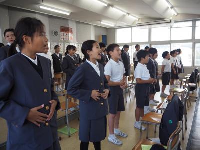 10月15日(木)の5・6限目に歌手の仲谷響子先生をお招きして合唱の特別練習を行いました。5年生は、11月13日に鳳至・大屋小との共催で行う合唱発表会のために練習を続けています。今年度はアラジンの主題歌でも知られている「A whole new world」を歌います。仲谷響子先生には、正しい立ち方を教えてもらい、発声の練習を繰り返し行いました。口や目を全開に開き、体全体で歌うというアドバイスを子どもたちは素直にきき、自分のお腹が膨らんだり縮んだりするのを感じながら、一生懸命に取り組むことができました。また、仲谷先生が一節お手本で歌うと、その響き渡る声に子どもたちは「すごい!」「うますぎ!」と歓声をあげていました。仲谷先生の特別練習は、継続して行います。どうぞ、よろしくお願いします。