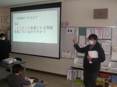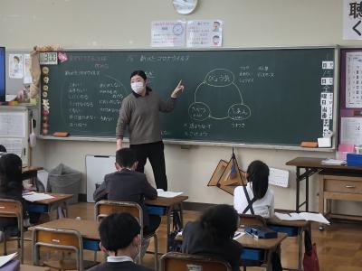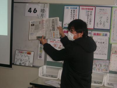 1月18日(月)5限目に、地域の先生による出前授業が行われました。今日、お越しになったのは、北陸中日新聞輪島通信局 日暮 記者さんです。5年生の社会科「情報をつくり、伝える」の授業の中で、新聞について内容があります。それに合わせて現役の新聞記者さんに、ご来校頂いたわけです。日暮記者さんからは、どのようにして記事になるのか、記者はどのようなことに注意して取材しているのか等、インタビュー形式でいろいろな質問に答えて頂きました。その中には、私たちは到底知ることのできないお話も聞くことが出来ました。まさに本物です!本当に有意義な1時間でした。