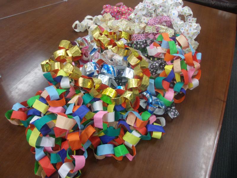 1月28日河井小学校に素敵なプレゼントが届きました。それは、素敵なデザインで作られた「輪飾り」です。趣味で製作している「鶴」を折った時にできる折り紙などの紙を1つ1つ手作業でつなぎ合わせて「輪飾り」を作ったそうです。卒業する6年生のために使って頂ければということでした。その場に居合わせた教職員全員が心が温かくなりました。2月に行われる6年生を送る会で飾らせて頂き、6年生をはじめ全校児童に紹介したいと思います。大変心のこもったプレゼント本当にありがとうございました。
