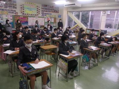 2月25日(木)の5限目に6年生が輪島中学校へ、体験学習に行って来ました。教科は、英語科で3年生教室2クラスで海組、空組の授業が行われました。海組は、久田 倫子先生、空組は田下 由布子先生に担当して頂きました。授業は、All Englishで行われ、聞き取れる?答えられる?というような子どもたちにとって緊張感のある授業でした。