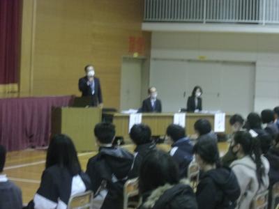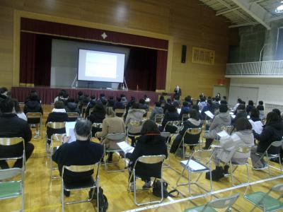 2月4日(木)の5限目に6年生の授業参観、6限目に輪島中学校入学説明会が開かれました。雪の降る大変寒い日でしたが多くの保護者の皆様にご来校頂きました。中学校入学説明会では、児童・保護者を合わせると100名ほどになるため、新型コロナ感染症対策として、やむを得ずストーブを用意して体育館での開催となりました。輪島中学校からは、永草校長、相神主幹教諭、熊野事務主査が来校され、大変わかりやすく中学校のことを説明してくださいました。児童は、4月から始まる中学校生活に期待と不安でいっぱいな様子でした。大変お忙しい中ご来校頂いた輪島中学校職員の皆様、6年生保護者の皆様、本当にありがとうございました。