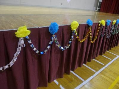 先日もお知らせしましたが、地域にお住まいの方に寄付して頂いた輪飾りを、ステージ前に飾らせて頂きました。丁寧な手作り作品で6年生を送る会を彩ってくれました。本当にありがとうございました。