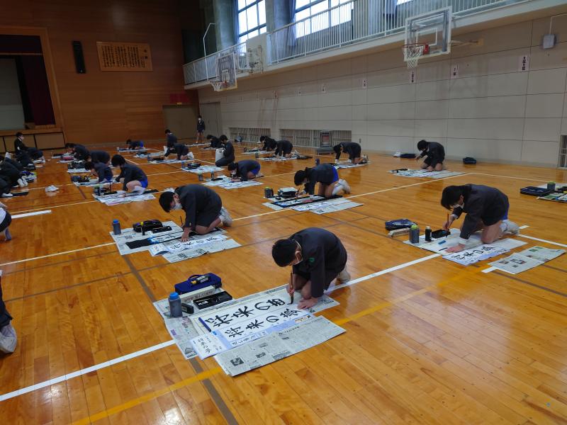 始業式の後、書き初め大会が行われました。書き初めは、新年の目標や抱負を書いたり、字の上達を祈念したりして行われてきました。この書き初めの意味をみんなで確認し、太鼓の合図で大会を開始しました。児童は冬休み期間に一生懸命練習した成果を発揮しようと集中して取り組んでいました。
