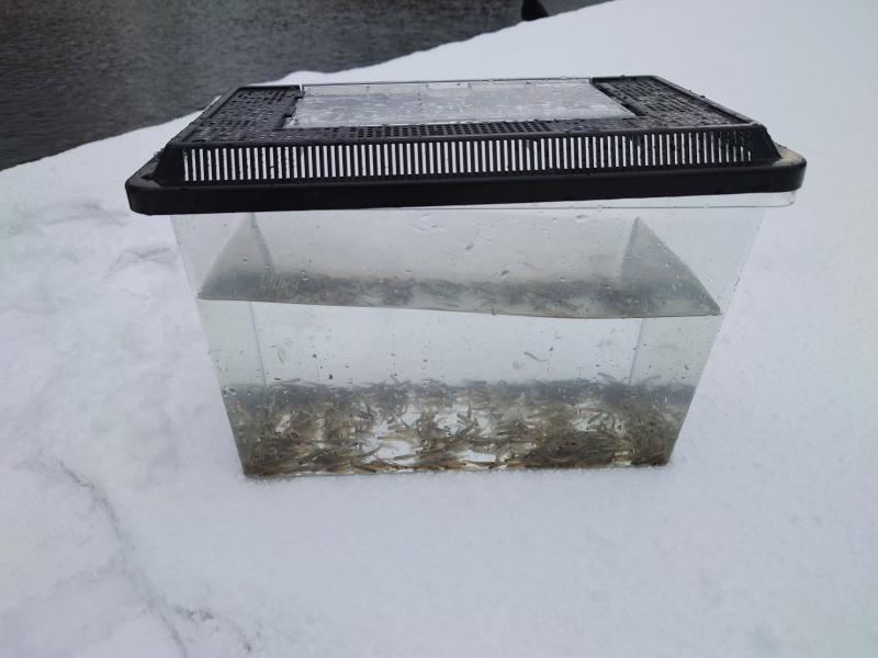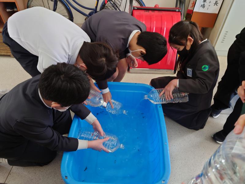 1月20日(木)に、12月から各学級で育ててきたヤマメの稚魚を放流しました。今年は天候が悪く、川まで放流にいくのは危険だったので、職員玄関のたらいに全校で育てたヤマメを集め、校務員の宮崎さんに代わりに放流していただきました。放流されたヤマメは元気よく川を泳いでいきました。
