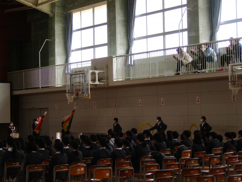 体育館で明日の1年生を向ける会に向けて金管鼓隊の練習がありました。