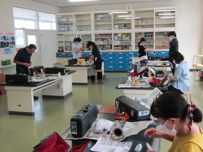 9:00からの校内研修後に洗浄した金管を職員が組み立てています。