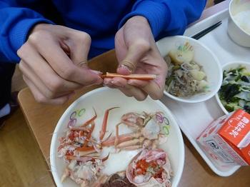 給食の時間には、輪島市漁協のみなさんが6年生にカニの食べ方を教えてくださいました!